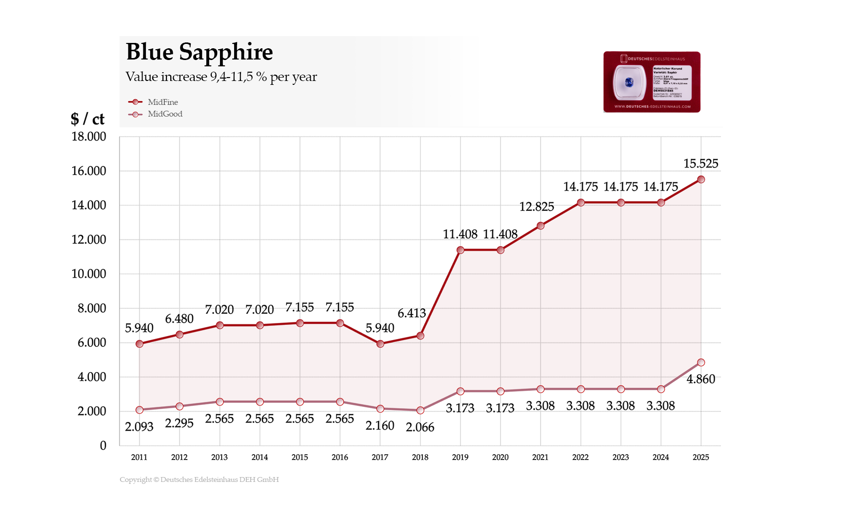 Historically, high-quality colored gemstones have demonstrated strong price stability and long-term value appreciation—with low correlation to stock market volatility and economic fluctuations.