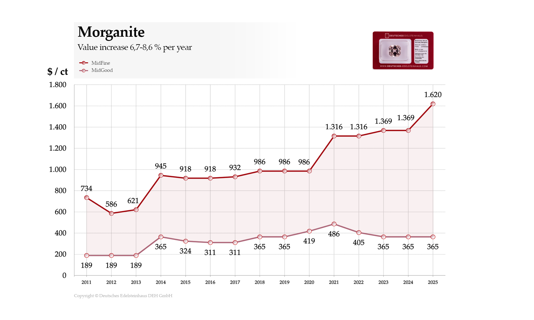 Market position: Morganite is seeing increasing international demand, particularly in Asia. High-quality material comes primarily from Brazil, Madagascar, and Mozambique. Deposits are limited, and clean, well-colored rough must be sourced with increasing selectivity.